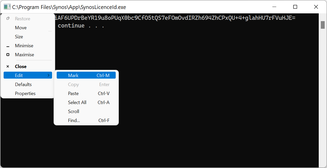 Under Windows, you can also just double-click on XentaraLicenceId.exe, or select “Xentara licence ID generation tool” from the Windows Start Menu, to show the licence key. Since XentaraLicenceId.exe is a so called “console application”, the licence key will be shown in a Windows console window. Text in Windows console windows can be selected using the mouse, and copied by pressing Enter. If selecting text with the mouse does not work, you may have to open the console’s menu by clicking on the icon in the title bar, and choose “Mark” from the “Edit” sub menu, as shown here: